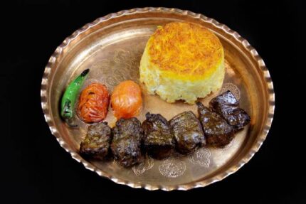 1skewer Koobideh, 1 Skewer Chicken kebab, 1 Skewer Chenjeh kebab, grilled tomato, Rice with Tahdig